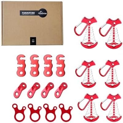 FUSAATOU Tent Rope Tensioner Set, Guyline Cord Adjusters + Deck Anchors Pegs, Red Aluminum, 2.5-4mm Rope Compatible, 18-Pack
